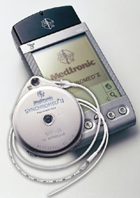 Medtronic, whose Personal Therapy Manager (PTM) is based on a Palm Handspring, developed the device after suggestions from doctors. The device (right) is connected via a wireless link to a drug infusion system, called SynchroMed, that delivers medication via catheter to the spinal cord. It is aimed at patients who experience chronic pain, and costs up to $50,000 (£25,000).